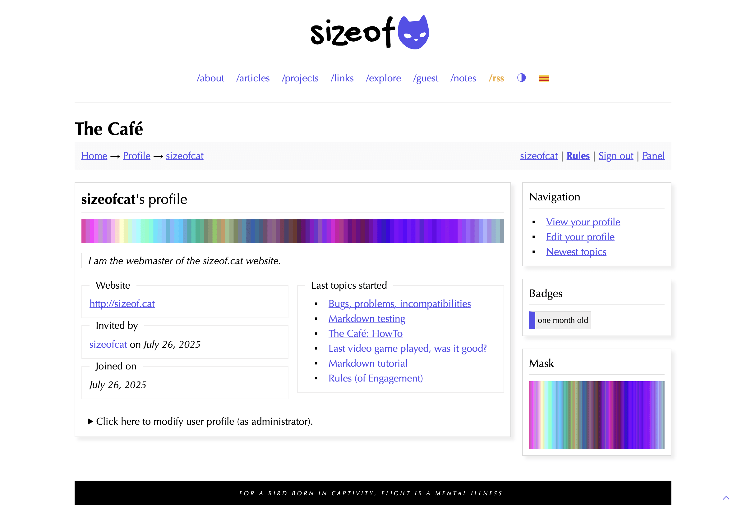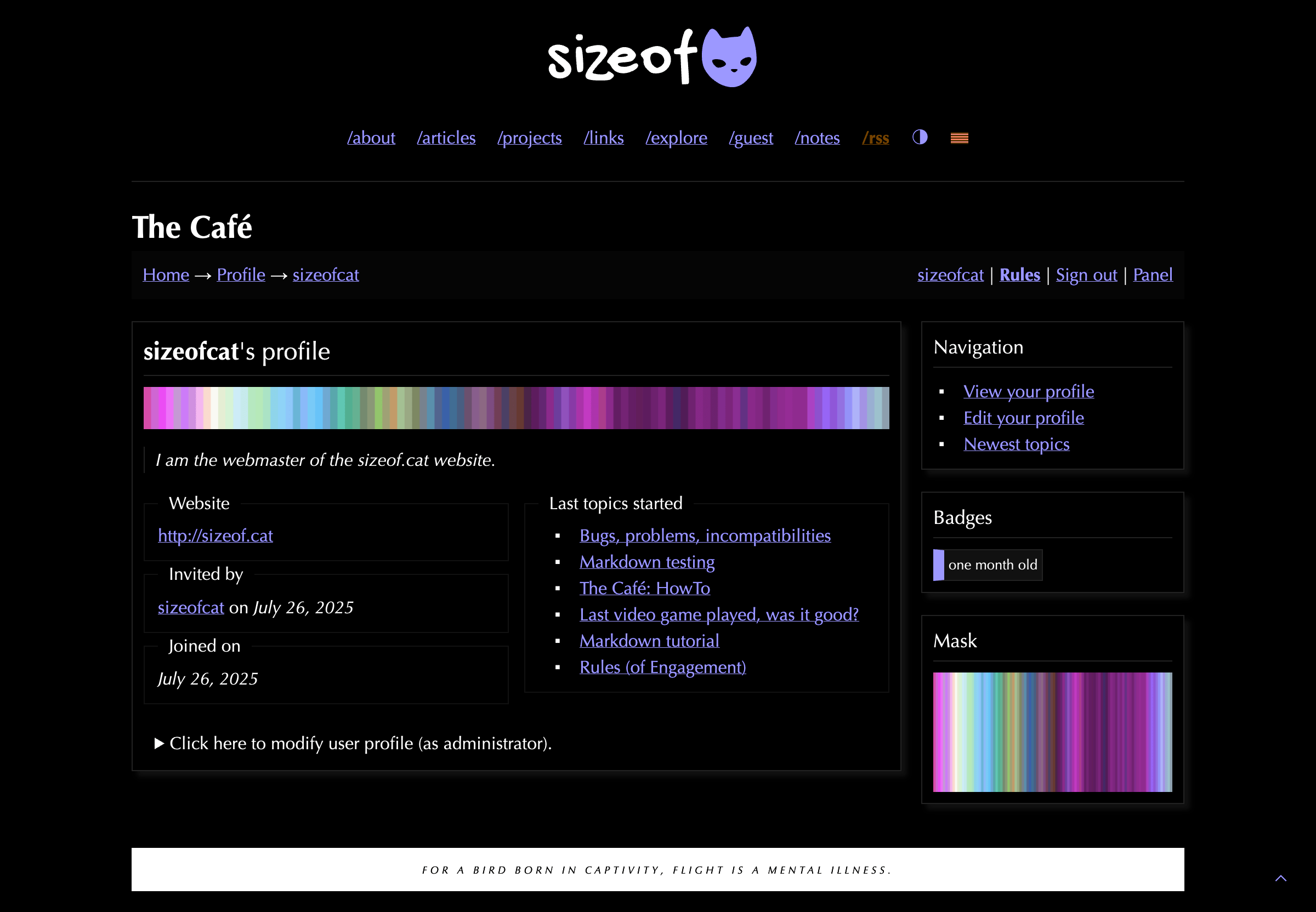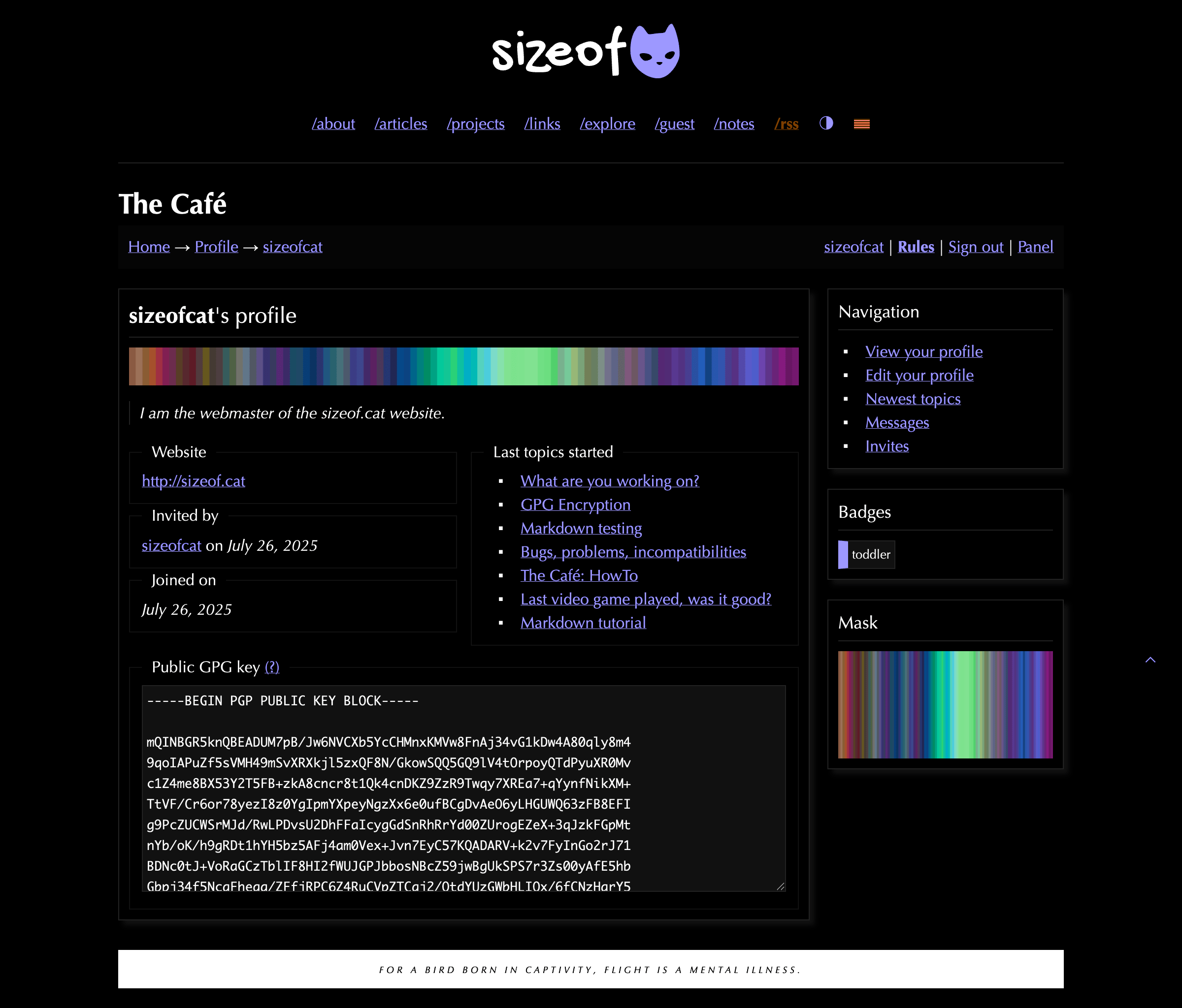 Well, you probably know about The Café by now: it’s a private, invite-only community I have started on August 29, 2025, after being in development for about one month before. We currently have about 160 members so far, and we talk about various stuff (both on the Café and its dedicated IRC channel), we plan events and do puzzles. And the latest puzzle challenge was something I named Fishy and it involved virtual fishing in the Café’s wate… API for clues and secrets. The reward is a unique member title (<Master baiter>) for the first solver + a cool Café badge, and a different title (<Fisher>) + the same badge for everybody who solves it after.