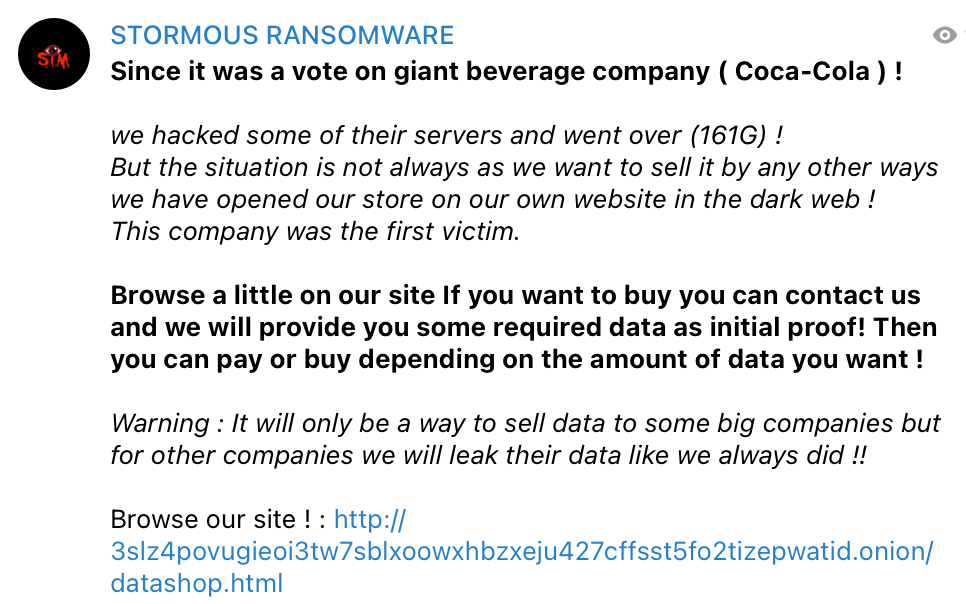 Stormous Ransomware group claims to have hacked Coca Cola and stole 161GB of data from them. I hope the ultra-mega-secret recipe is among the data retrieved. Next, KFC and their famous almost-chicken wings!