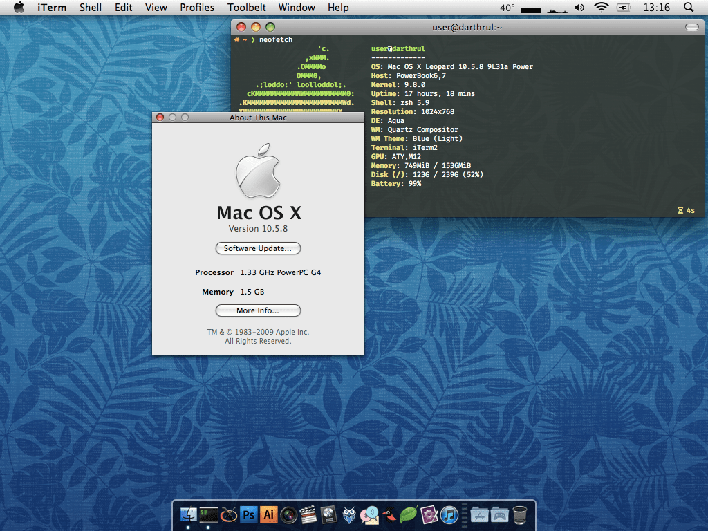 I won’t be talking about the hardware updates I aready did, replacing the Fujitsu HDD with a SSD and replacing the Combo Drive with a DVD Super Drive, because those are basic stuff. Buy new components, open laptop, disconnect old components, replace with new components, done. Maxing the RAM capacity is something you should do, too, OS X Leopard will thrive with more RAM.