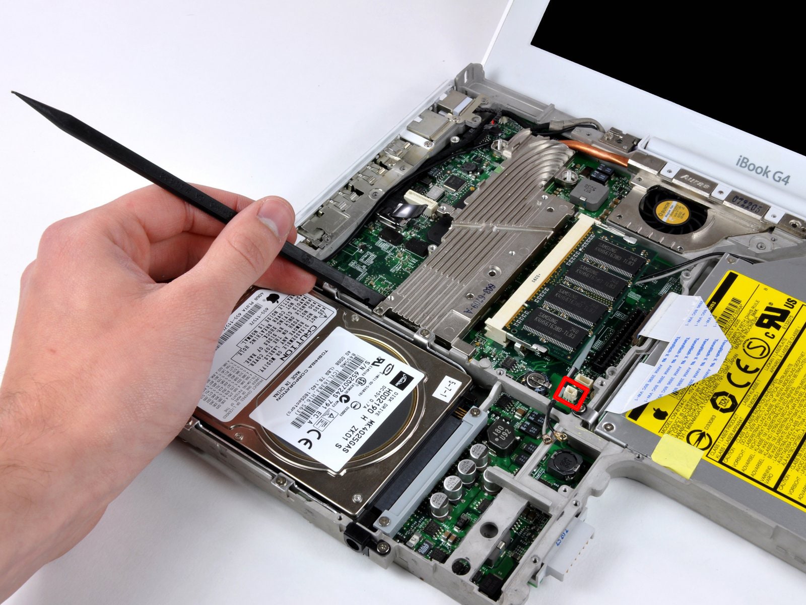 The 2005 iBook has a dedicated socket for the suspend sensor (the sensor itself sits on top of the DVD unit, to the right of the keyboard, under the metal screen), it’s below the trackpad connector on the logic board, squared in red in the photo below (where the socket for the Bluetooth module used to be on older iBook models).