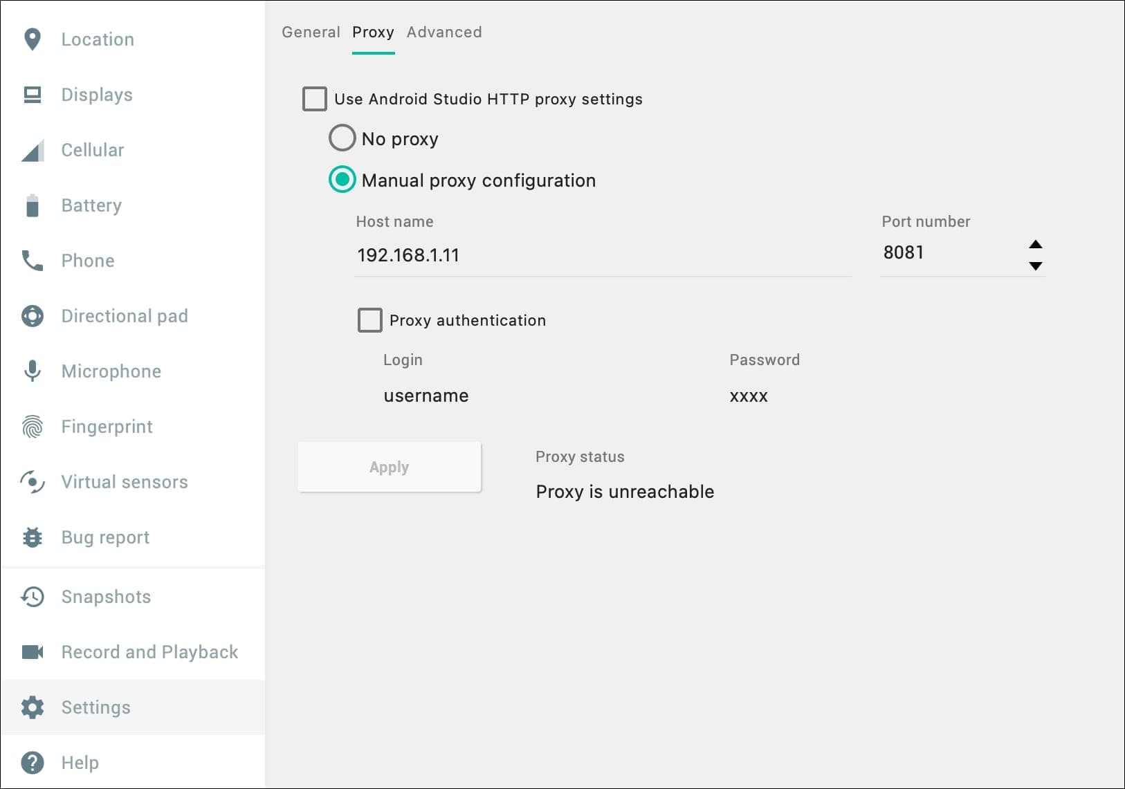 - Open Extended Controls in the emulator, Settings, go to the Proxy tab, click on the Manual proxy configuration checkbox and fill in the Host name and Port number fields as in your Burp Suite configuration.