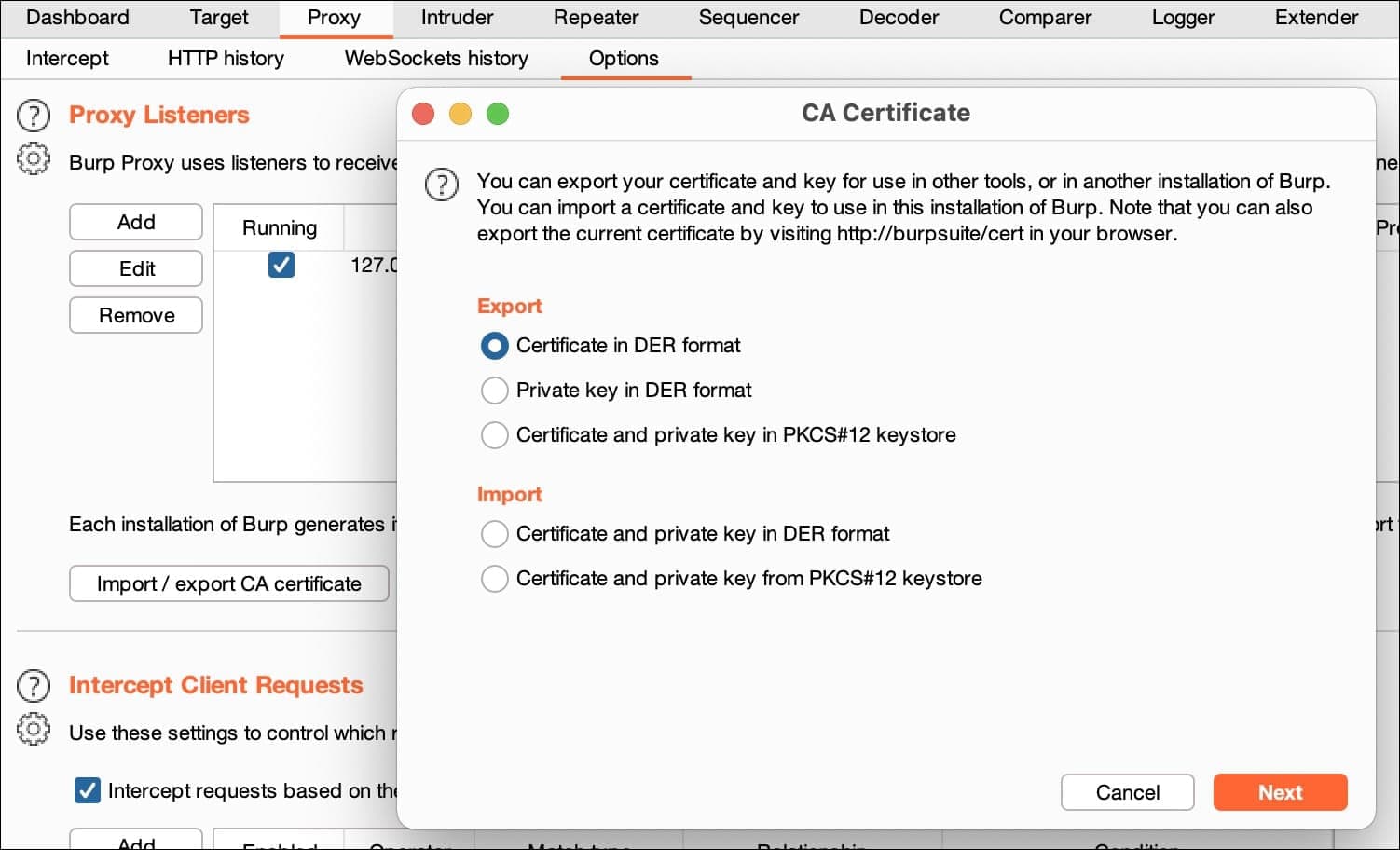 .DERformat and save it ascacert.der, for example. Open Burp Suite, go to Proxy -> Options and click on the Import / Export CA certificate button.