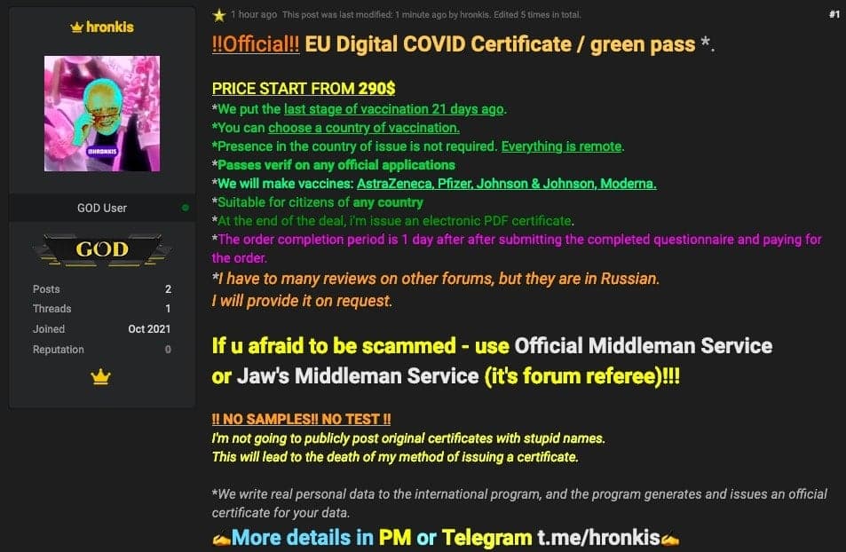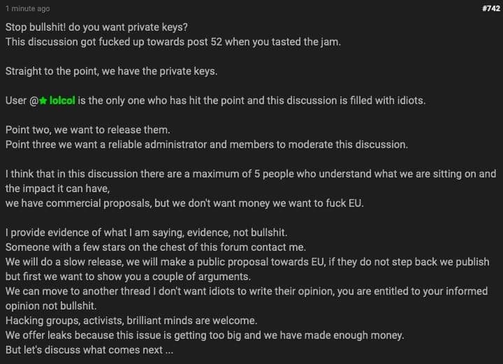 A message (mirror image) on the RaidForums board, could be fake, could be not fake. Another post appeared on RaidForums, posted by someone that goes by the name hronkis (Хронкис). Доктор Хронкис has a Telegram channel where he sells some stuff and what I noticed is that the color of the brush (and style) in this channel post is very similar to the one in the initial 4chan post. Make what you want of it.