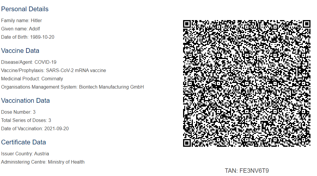 Based on an image leaked on 4chan (of course), somebody seems to have access to the portal. Because that’s how you get Spongebob Squarepants from UK, Joe Mama from Zimbabwe and of course, our old friend Adolf Hitler from Austria vaccinated. Keep in mind that all the three certificates seem to be signed with North Macedonia’s key, KjE8h58xh7A=.