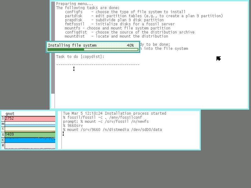 Download the latest Plan 9 archived iso and extract it somewhere. Select the ISO for the Plan 9 Virtual Machine’s CD drive and boot normally: you can either install the operating system or test it from the CD. Install is pretty simple if you know what you are doing, the filesystem install stage will take a while, though (let’s say 45-60 minutes).