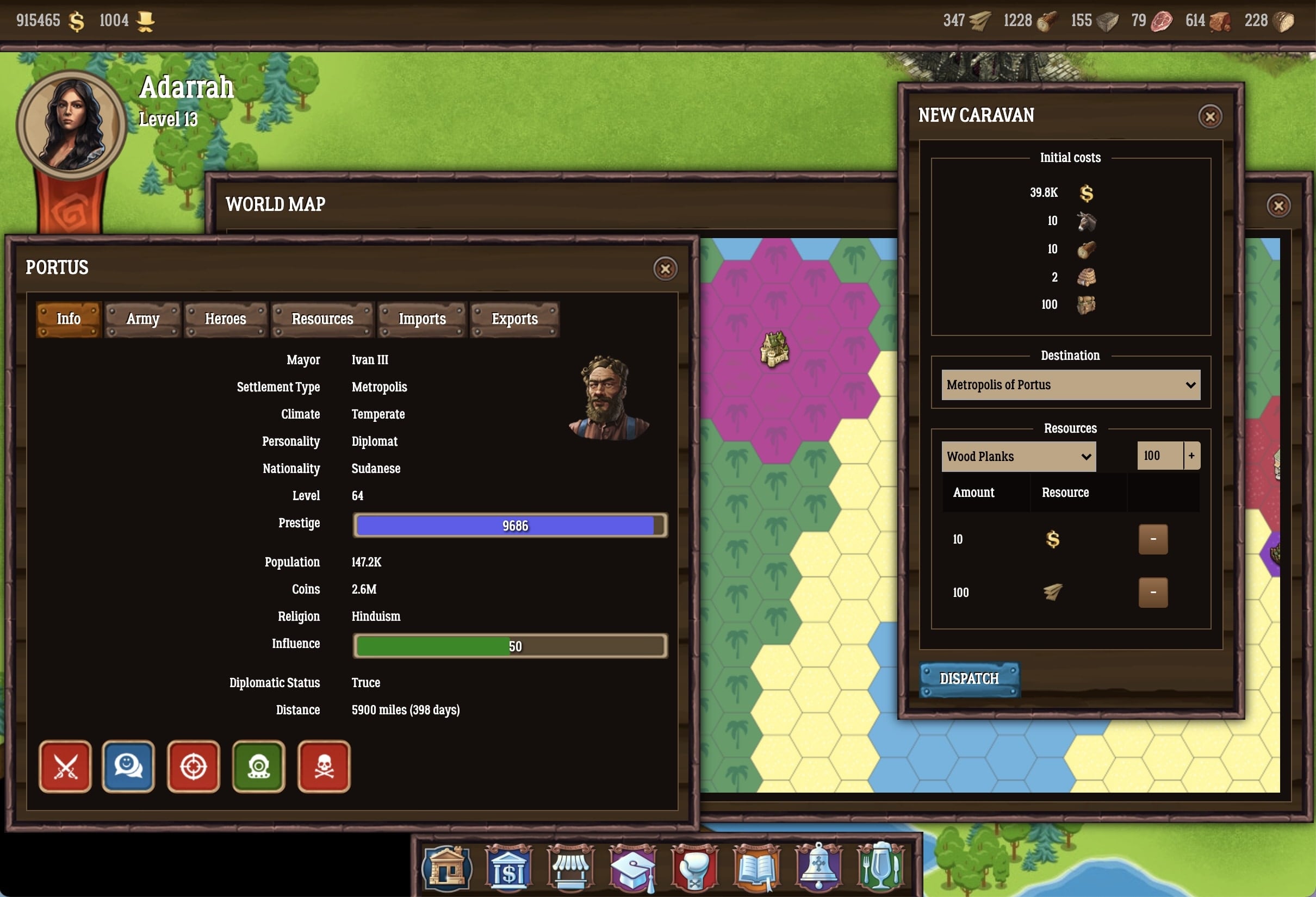 - ☑ Random events that can change your diplomacy status with the other cities, give you coins or random resources.