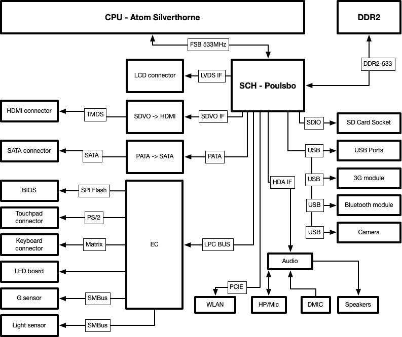 | Chipset | Intel US15W (Poulsbo), info, datasheet, die shot, annotated die shot |
