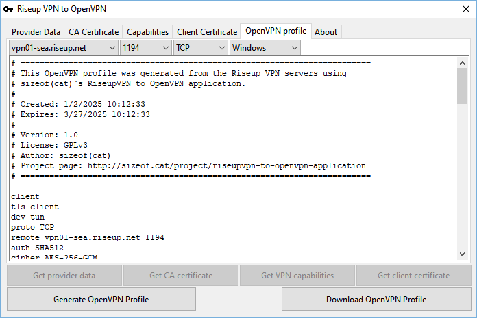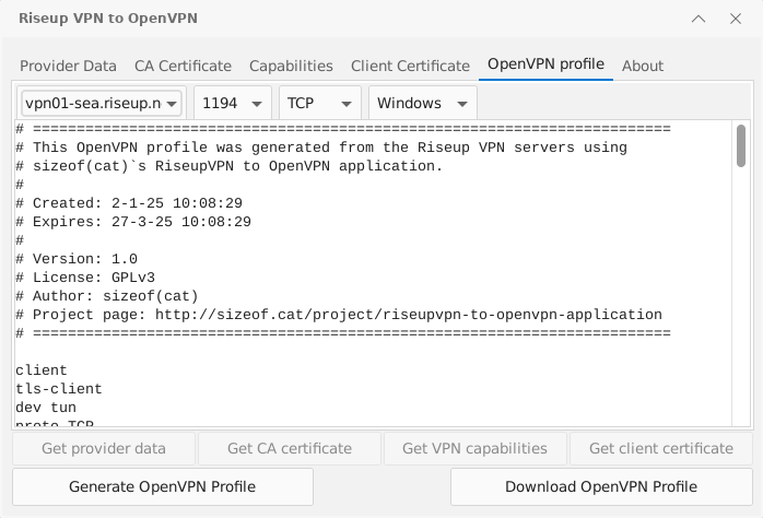 RiseupVPN to OpenVPN is an application that helps you convert the RiseupVPN data from the official servers into one (or multiple) OpenVPN profiles. It’s written in Pascal under the Lazarus IDE and designed to run both on modern OSes (Windows 11/10, macOS, Linux) as well as Windows 2000, XP and Windows 7 32bit.