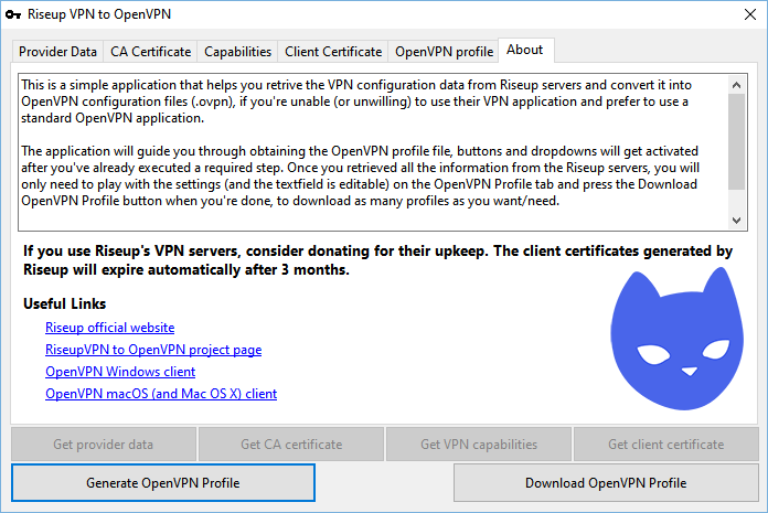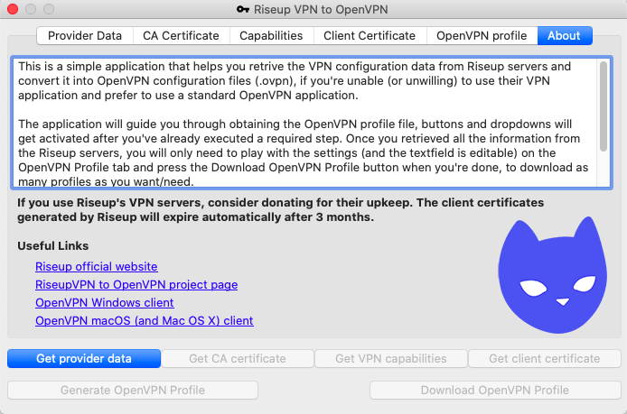 As a small easter egg, if you click on my logo image in the About tab, you will enable the Renew tab and function, which allows you to renew expired OpenVPN profiles (exported by this application). All Riseup VPN client certificates expire after 3 months, so they will need to be either renewed or new ones re-generated with a new client certificate.