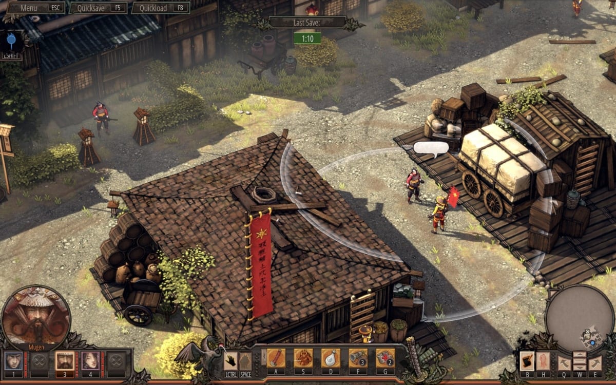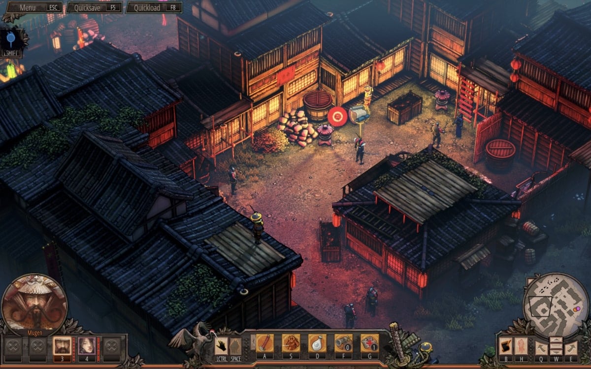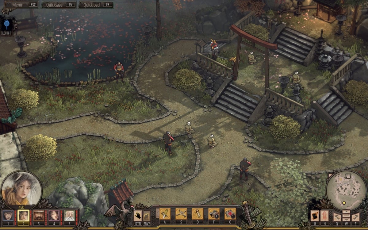 There are five characters (Hayato the ninja, Yuki the thief, Oshirō Mugen the samurai, Aiko the kunoichi and Takuma the veteran) you can control but you might not have them all available for one mission; they have lethal skills, can do all kind of tricks, can climb ladders and hide inside buildings and bushes but Mugen and Takuma can’t swim.